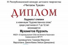 Поздравляем учащегося Сарайлинской ООШ Мухаметова Нурзиля , занявшего I степень в III Республиканском конкурсе детского творчества "Читаем Тукая" в номинации "Художественное слово"