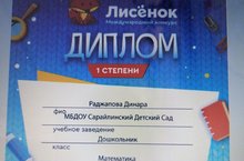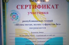 Раджапова Динара (6 яшь) "Шушы яктан, шушы туфрактан без" конкурсында катнашып сертификатка ия булды./ Раджапова Динара (6 лет) приняла участие в конкурсе "Шушы яктан, шушы туфрактан без" и получила сертификат.