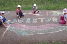 Отдыхающие лагеря нарисовали рисунки на асфальте на тему: "Сабантуй".