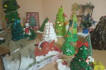 В детском саду педагоги совместно с родителями и воспитанниками оформили выставку поделок "Новогодняя елочка", выполненные из разных материалов.