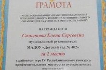 Музыкальный руководитель МАДОУ "Детский сад №402" Самсонова Елена Сергеевна заняла 2 место в районном туре IV Республиканского конкурса профессионального мастерства русскоязычных воспитателей "Я разговариваю и работаю по-татарски-2017"