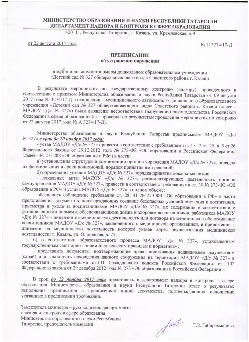 Предписание департамента надзора и контроля в сфере образования Министерства образования и науки РТ
