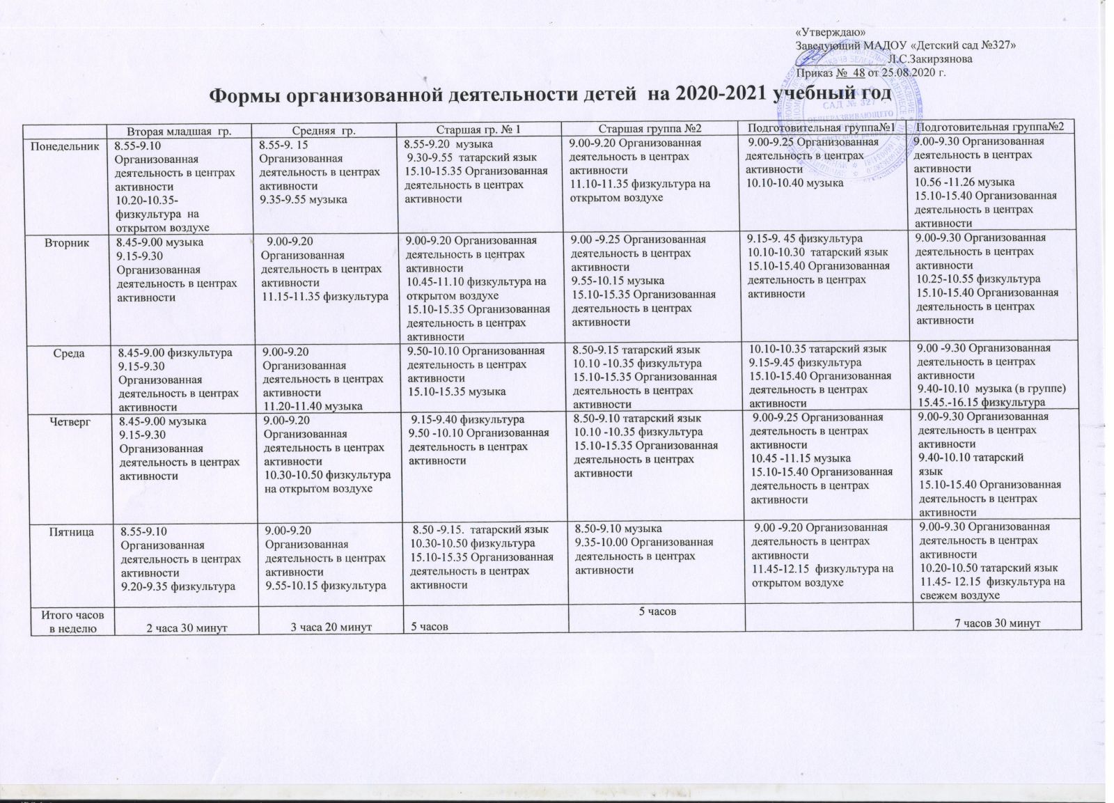Форма организованной деятельности детей (сетка занятий) на 2020-2021 учебный год