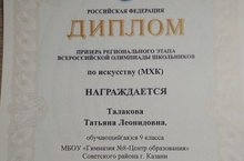 Подарком преподносит жизнь!Поздравляем ученицу 9А класса, Талакову Татьяну с победой в олимпиаде по искусству (МХК). Молодец! Желаем всегда стремиться к победе, никогда не терять упорства и сил. Верь в себя и программируй себя на успех. Не бойся новых вопросов и знаний, не отказывайся от новых идей и увлечений. -