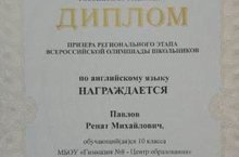 Поздравляем Павлова Рената - призёра регионального этапа всероссийской олимпиады школьников 2018-2019 учебного года по английскому языку и его наставника Брусову Людмилу Васильевну. Желаем дальнейших успехов!