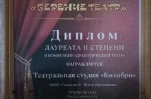 16 января юные актеры театральной студии "Колибри" нашей гимназии (рук. Л.Д. Фахрутдинова) Ваничкина Анастасия и Хамидуллин Адиль приняли участие в церемонии награждения Всероссийского фестиваля "Беренче театр" в Каз Гик. Коллектив стал лауреатом II степени со спектаклем "Гимназистка". Ребята также приняли участие в мастер-классе по актерскому мастерству и экскурсии по Институту. Поздравляем педагога и ребят!