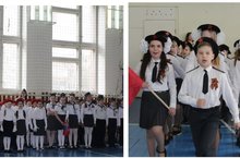 Далее состоялся смотр строя и патриотической песни "Наследники Победы" для учащихся 2-8 классов. На импровизированном плацу ребята продемонстрировали элементы строевого шага под маршевую песню.