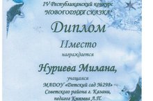 Стали известны результаты IV Республиканского конкурса «Новогодняя сказка», где воспитанница нашего детского сада Нуриева Милана заняла II место и была награждена дипломом.