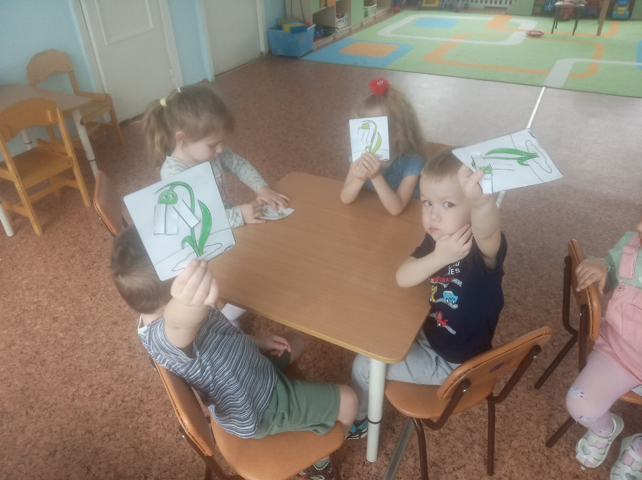 В этот день к детям 2 младшей группы №3 пришел после зимней спячки Медвежонок. Он хотел приготовить сюрприз для мамы и собрать подснежники. Ребята рассказали Медвежонку об этих удивительных цветах, поиграли в игры и предупредили, что подснежники занесены в Красную Книгу как исчезающий вид, собирать их нельзя. А напоследок дети предложили Медвежонку сделать открытку с подснежниками. У них неплохо получилось.