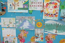 В фойе детского сада организована творческая выставка рисунков "Весна красна", подготовленная воспитанниками всех возрастных групп совместно с родителями