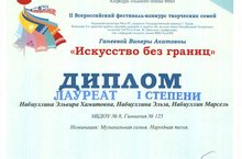 14 октября 2017 года прошел II Всероссийский фестиваль - конкурс творческих семей «Искусство без границ», где наш детский сад представляли наш музыкальный руководитель с воспитанником. Инициатором, идейным вдохновителем этого фестиваля является Народная артистка РФ и РТ, лауреат Государственной премии им. Г.Тукая, Кавалер 2-х Орденов, Профессор Винера Ахатовна Ганеева.Мы от всей души поздравляем Эльвиру Хамитовну с дипломом 1 степени в номинации "Музыкальная семья", желаем ей дальнейших творческих успехов!