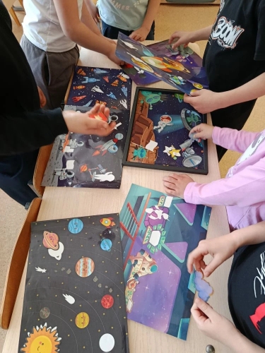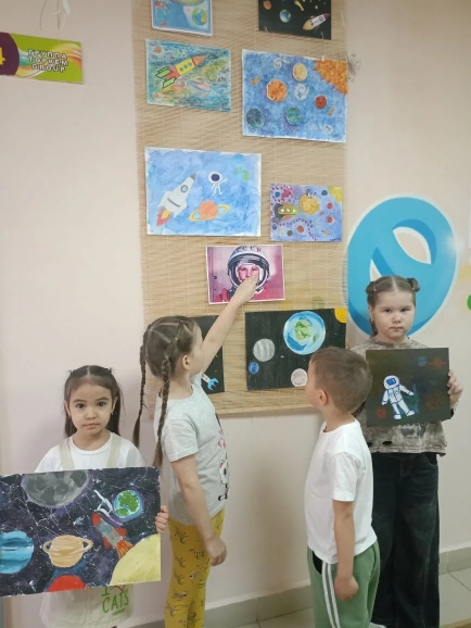 Дети с энтузиазмом создавали рисунки и поделки, посвящённые космосу. Их работы были полны фантазии и творчества, отражая их представления о Вселенной и планетах.