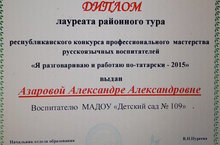 Воспитатели ДОУ. приняли участие в районном туре Республиканского конкурса профессионального мастерства русскоязычных воспитателей "Я разговариваю и работаю по-татарски - 2015". Результат: Азарова А.А. награждена дипломом лауреата районного тура (в пятерке лучших), Жгенти И.М. получила сертификат участника районного тура. Молодцы!!!