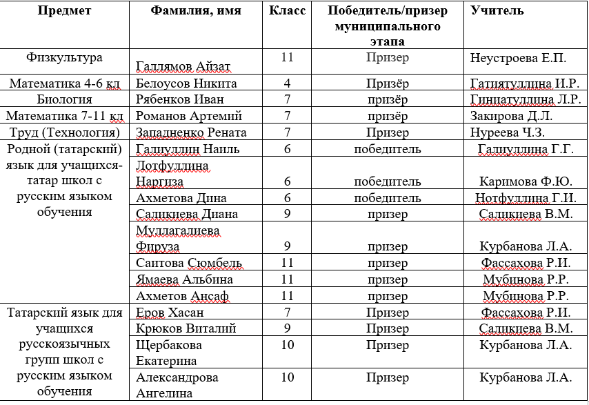 Завершился муниципальный этап ВОШ и РОШ 2024-2025у.г. Муниципальный этап был проведен с 8 ноября по 20 декабря по математике, физике, химии, географии, астрономии, биологии, экологии, праву, искусству, технологии, географии, экономике, обществознанию, технологии, русскому языку, литературе, основам безопасности жизнедеятельности, физической культуре, родному языку для учащихся русский и татарских групп. Призерами и победителями стали 17 учеников нашей школы. Подробно ознакомиться с результатами можно, перейдя по ссылке. Результаты МЭ.