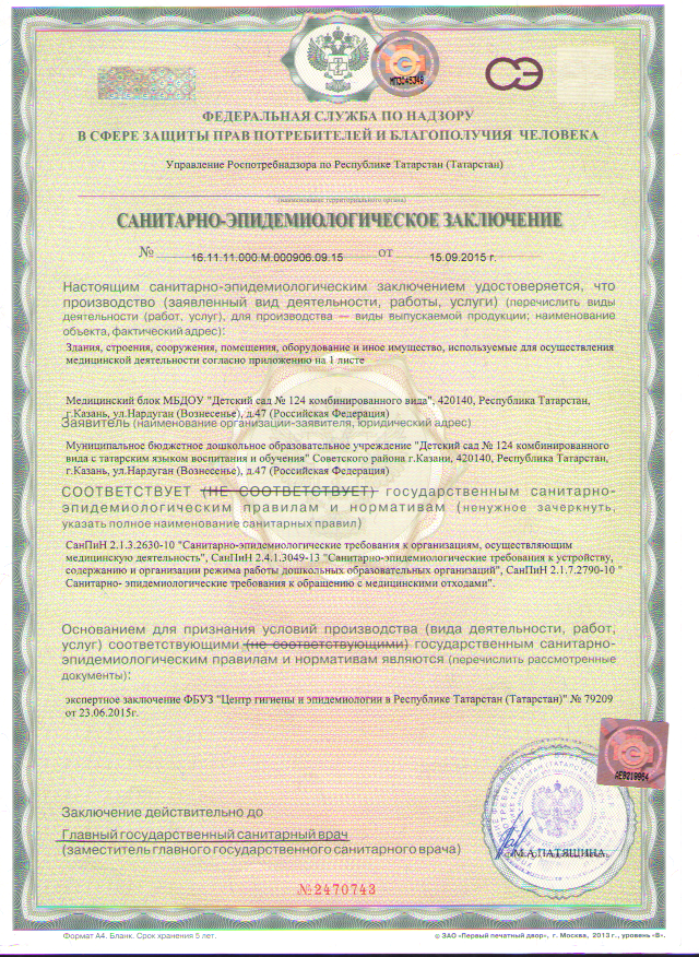 Санитарно-эпидемиологическое заключение от 15.09.2015