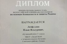 Сегодня завершился региональный этап Всероссийской олимпиады школьников по основам безопасности и защиты Родины. Ученик 11Б класса Лотфуллин И. стал призером! Поздравляем нашего ученика и его руководителя Шамсевалиеву Г.Ф.!