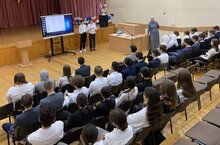 Бүген, 7 нче сентябрь көнне, 7А, 7Б, 7В, 7Г, 8А, 8Б, 8В һәм 8Г сыйныф укучылары өчен спорт залында янгын куркынычсызлыгы буенча дәрес үтте. Татарстан Республикасы Гадәттән тыш хәлләр министрлыгы инспекторлары балаларга янгын чыкканда үз-үзеңне тоту кагыйдәләре турында сөйләделәр, балаларны янгын сүндерү эшенең тарихы, үзләренең һөнәрләре һәм экипировкалары белән таныштырдылар.