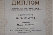 Рус теленнән Россиякүләм олимпиаданың региональ этабында җиңүче Нәҗипова Мәрьямне, рус теле һәм әдәбияты укытучысы Гөлназ Альбертовнаны һәм Мәрьямнең әти-әниләрен котлыйбыз, алда зур уңышлар телибез!