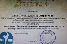 Ел саен Казан дәүләт мәдәният институтында VII Халыкара тәрҗемәчеләр конкурсы «Naoborot» уздырыла. Быел конкурс 7 нче тапкыр үткәрелде. Безнең лицей данын 11 нче сыйныф укучысы Ситтыкова Эльвина яклады. “Жюри тәкъдим иткән проза текстын татар теленнән инглиз теленә тәрҗемә” номинациясендә ул мәктәп укучылары арасында җиңү яулады. Эльвинаны һәм аның остазы Миләүшә Вагыйз кызы Шәңгәрәеваны җиңү белән котлыйбыз!