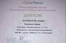 Учащаяся школы Халикова Сабина (преп.Футина Наталья Владимировна) достойно и профессионально выступила на Международном конкурсе исполнительского искусства и творчества «TatarStars» и завоевала звание Лауреата III степени.