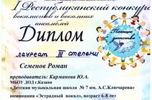 Преподавателя Карманову Ю.А. и ее ученика Семенова Романа с победой в I Республиканском конкурсе вокалистов!