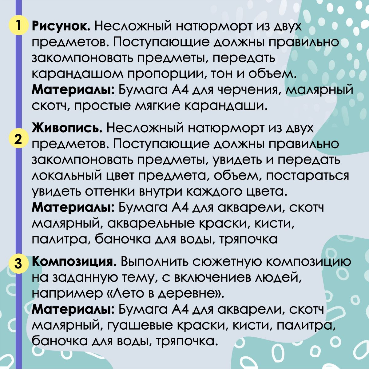 Творческий отбор будет проводиться по следующим дисциплинам: рисунок, живопись, композиция.