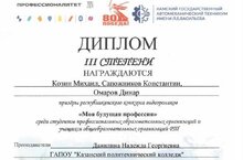 Студенты ГАПОУ "Казанского политехнического колледжа" приняли участие в республиканском конкурсе видеороликов "Моя будущая профессия" среди студентов профессиональных образовательных организаций и учащихся общеобразовательных организаций РТ" и заняли 3 место. Поздравляем и желаем новых побед!