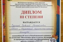 19 апреля 2024г студент группы Св-0222 Судаков Савелий занял 3 место в Республиканской олимпиаде по дисциплине "Математика" среди студентов, обучающихся по программам подготовки квалифицированных рабочих, служащих в ПОО РТ, руководитель Сафиуллина Р.Р.