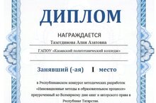 28 апреля 2023 года в Республиканском конкурсе методических разработок "Инновационые методы в образовательном процессе", приуроченного ко Всемирному дню книг и авторского права в Республике Татарстан, Тазетдинова Алия Азатовна заняла 1 место. Поздравляем!