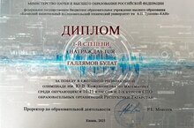 8 мая в КНИТУ-КАИ им А.Н. Туполева прошла региональная олимпиада по математике им. Ю.В. Кожевникова. Студент группы 912 Галлямов Булат набрал наибольшее количество баллов и занял 1 место (преподаватель Марданшина Д.И.). Благодаря победе, Булат заработал 10 баллов при поступлении на ВПО в КНИТУ- КАИ.