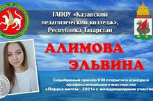 Поздравляем Алимову Эльвину со 2 местом в VIII Межрегиональном конкурсе профессионального мастерства «Паруса мечты -2021» с международным участием.