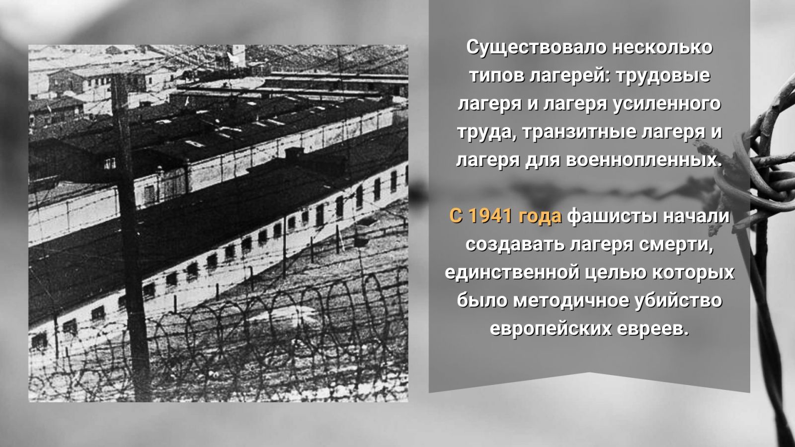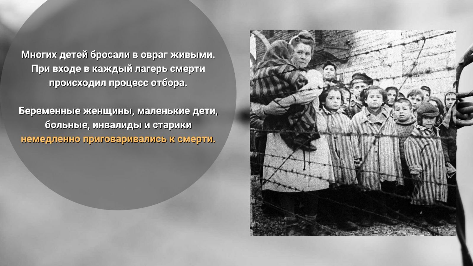 газовые камеры сразу по прибытии. Как свидетельствуют документы Нюрнбергского трибунала, погибли 2,8 миллиона человек, 90% из которых были евреи.