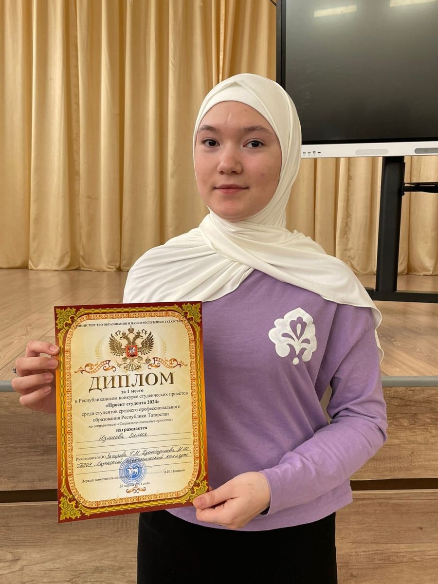 20 марта 2024 г. состоялся Республиканский конкурс студенческих проектов "Проект студента - 2024" среди студентов среднего профессионального образования Республики Татарстан. Студентка 911 группы Юзмиева З.Г. заняла I место по направлению "Социально-значимые проекты". Руководители: Загирова Г.М., Хуснетдинова М.Ш.