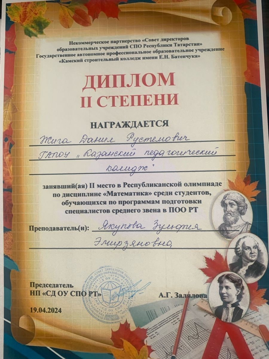 19 апреля 2024 года в ГАПОУ «КамСК им. Е.Н. Батенчука» прошла Республиканская олимпиада по дисциплине «Математика» для студентов профессиональных образовательных организаций РТ.
