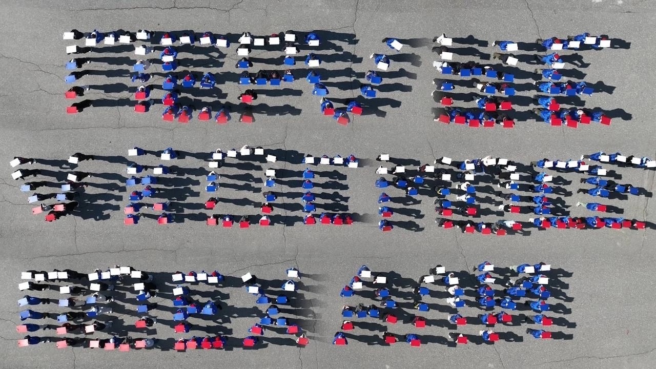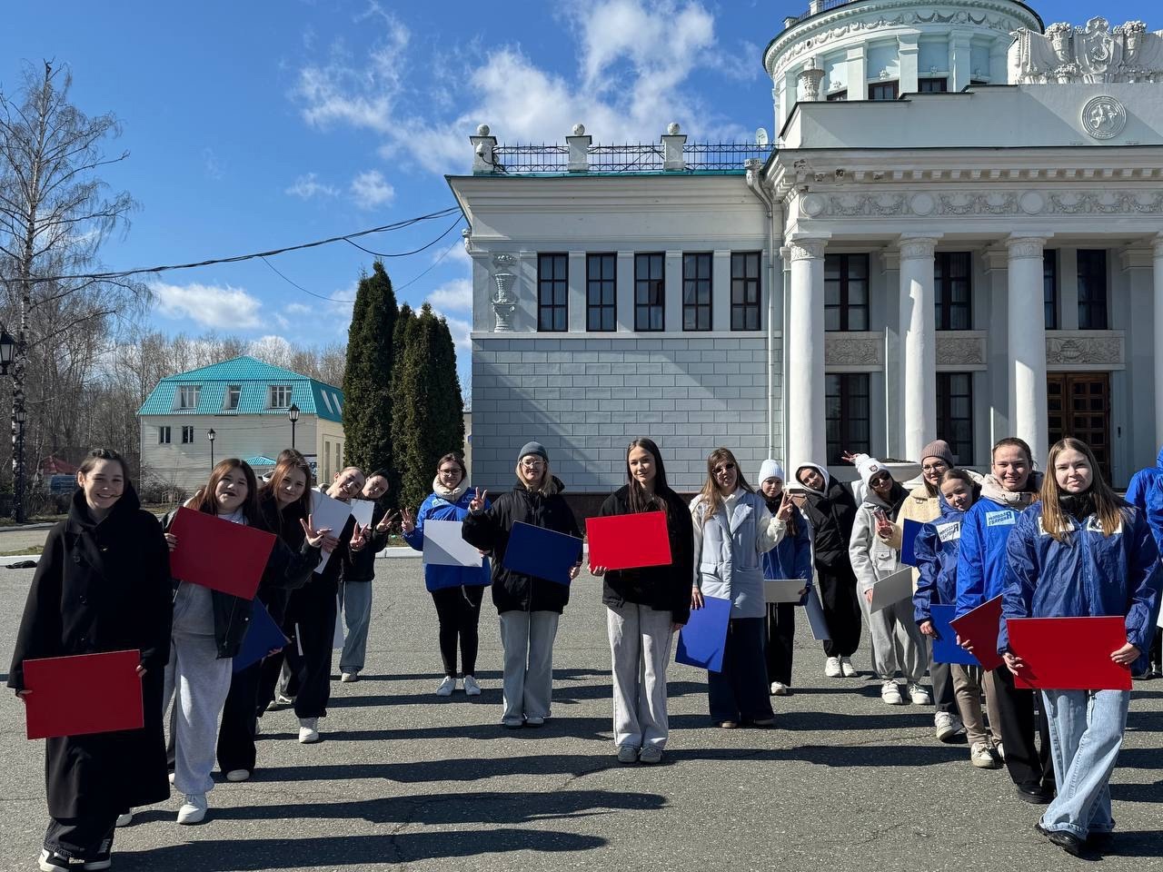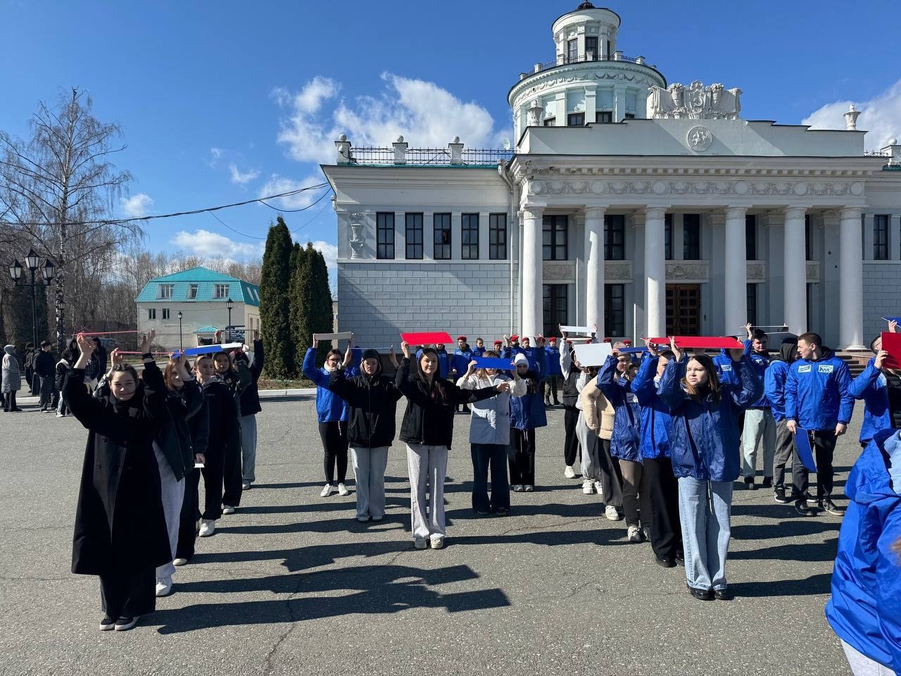 Молодежь Татарстана собралась на территории исторического парка «Россия – моя история» и выстроилась в фразы: «Мы первые в космосе» и «Поехали» с табличками цвета российского триколора.