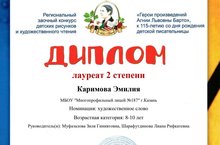 Поздравляем наших лицеисток Дибаеву Эльзу, получившую диплом 1 степени, и каримову Эмилию, получившую диплом 2 степени, на региональном заочном конкурсе детских рисунков и художественного чтения "Герои произведений А.Барто". Выражаем благодарность учителям Муфазаловой З.Г. и Шарафутдиновой Л.Р. за подготовку учениц.