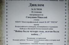 Поздравляем нашего лицеиста Симушина Николая, получившего диплом 2 степени на Всероссийском конкурсе, посвященном годовщине Победы в Великой отечественной войне "Война была четыре года, долгая была война...". Руководитель: Симушина Н.С.