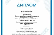 Поздравляем Хисматову Миляушу Шамилевну, получившую Диплом за 3 место во Всероссийском педагогическом конкурсе "Наши пернатые друзья" в номинации "Педагогические проекты".