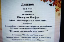 Ученики нашего лицея во главе с учителем литературы Смирновой О.Ю. приняли участие во Всероссийском литературном конкурсе, посвященном 125-летию со дня рождения Сергея Есенина, "Есенина песню поет нам осень..." и получили награды: