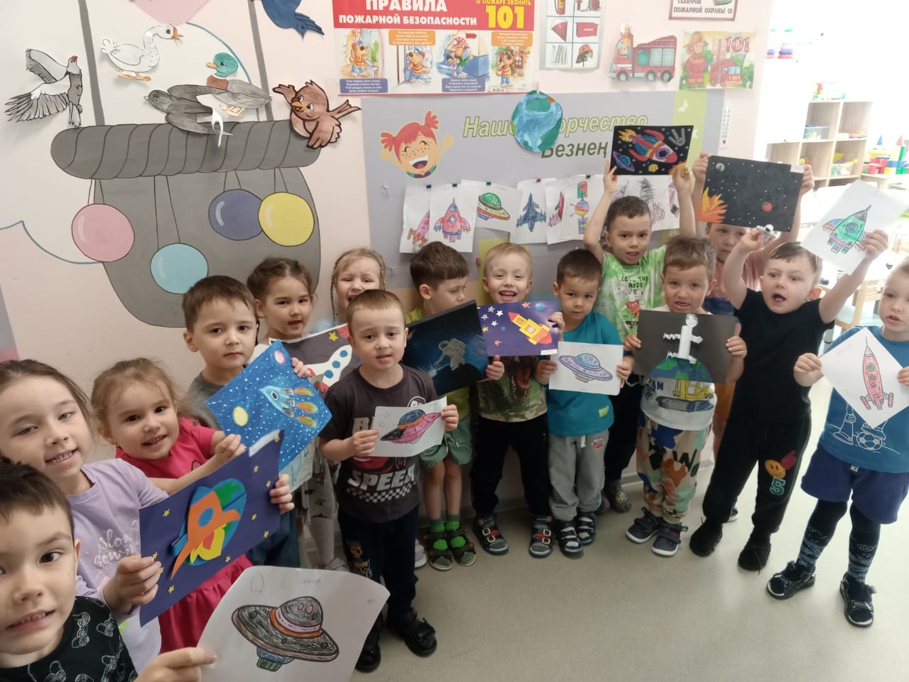 В детском саду прошла тематическая неделя, посвящённая Дню космонавтики. Воспитанники группы в течение недели знакомились с информацией о первом полете человека в космос и о космосе вообще.