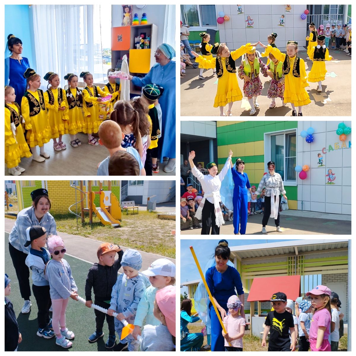В нашем детском саду прошёл долгожданный национальный татарский праздник - Сабантуй. К этому чудесному празднику присоединились дети всех возрастных групп. Сабантуй – любимый праздник наших воспитанников. Он проходит в нашем детском саду всегда в особой атмосфере – в атмосфере доброты и тепла. Наши дети знают, что это - праздник щедрости, веселья, дружбы. Праздник открыли стихами и песней “Сабантуйга барабыз”. Воспитанницы ансамбля "Уныш" подарили гостям задорный татарский танец. В гости к детям приходили сказочные герои Камыр и Батыр. Они рассказали историю национального праздника, помогли прочувствовать его дух, состязались в борьбе «Корэш». Дети познакомились с татарскими народными играми: "Разбивание горшка", "Бег с яйцом на ложке" ,“Кто быстрее донесёт воду", "Перетягивание каната". Детей порадовали подарки, участие в веселых играх и эстафетах. Праздник Сабантуй завершился весёлым и задорным татарским танцем! Было здорово, интересно, зажигательно! У детей и взрослых - море эмоций и впечатлений!