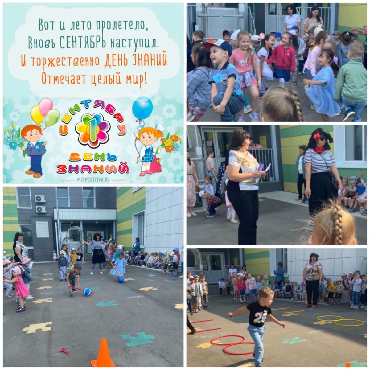Красный день в календаре!Праздник знаний в сентябре.Этот праздник всех важней,Этот праздник всех детей.Этот день у нас повсюдуОтмечает вся страна.Этот праздник самый лучший,Добрый день календаря!Первое сентября - момент начала новой жизни, нового этапа. Поэтому в этот день повсюду царит атмосфера праздника и радости. День знаний – это не только любимый праздник школьников, но также этот праздник с удовольствием отмечают и дошколята в детских садах. Дошкольники тоже с радостью встречают новый учебный год, который сделает еще старше, здоровее и умнее маленьких ребятишек. В нашем детском саду тоже прошёл праздник, посвящённый Дню знаний.В этот день для воспитанников детского сада педагоги устроили настоящий праздник. Было проведено весёлое развлечение. Дети с удовольствием отгадывали загадки, играли, участвовали в конкурсах и эстафетах, танцевали!Всем было очень весело и радостно!Мы поздравляем всех – родителей, детей, педагогов с этим праздником! Этот день открывает новый учебный год. Пусть он будет увлекательным, интересным и принесет новые знания, открытия и новых друзей! -