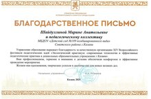Подводя итоги проведенной секции XIV Всероссийского фестиваля педагогических идей по экологическому образованию дошкольников, руководитель Детского сада №189 Шайдуллина Марина Анатольевна и педагогический коллектив были отмечены Благодарственным письмом Управления образования Исполнительного комитета муниципального образования г.Казани.