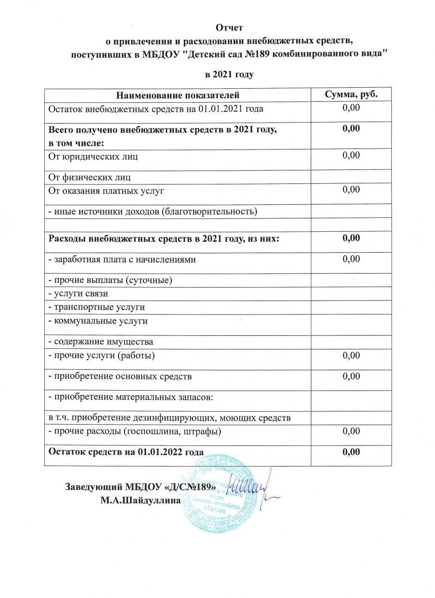Отчет о привлечении и расходовании внебюджетных средств МБДОУ №189 за 2021 год