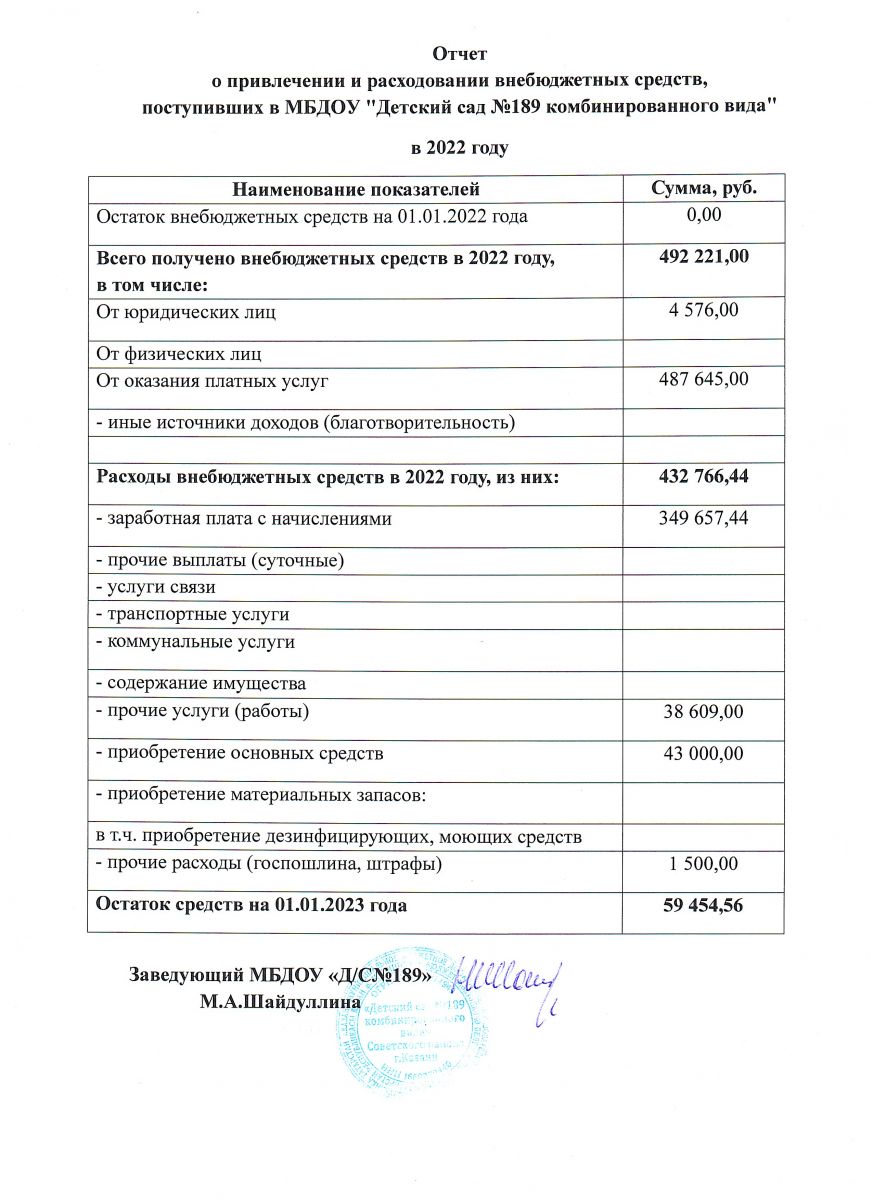 Отчет о привлечении и расходовании внебюджетных средств МБДОУ №189 за 2022 год