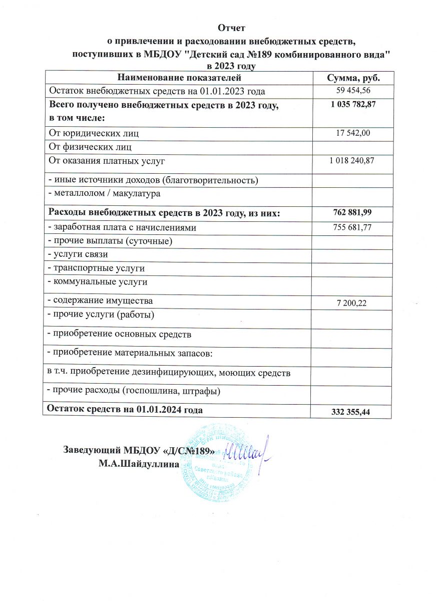Отчет о привлечении и расходовании внебюджетных средств МБДОУ №189 за 2023 год