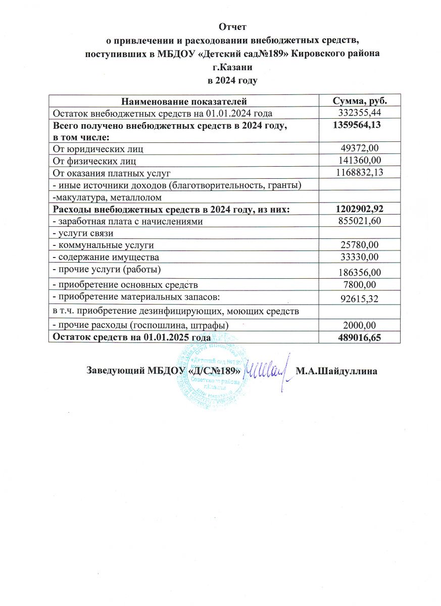 Отчет о привлечении и расходовании внебюджетных средств МБДОУ №189 за 2024 год