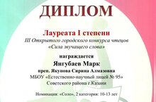 21 февраля в детской школе искусств им. М. А. Балакирева прошел III городской открытый конкурс чтецов учащихся отделений театрального искусства учреждений дополнительного образования г. Казани "Сила звучащего слова".В конкурсе принял учасnие наш ученик 5 «И» класса - Янгубаев Марк и завоевал первое место в номинации «Соло». Всего в конкурсе приняли участие 76 человек в трёх возрастных категориях.Поздравляем Марка!