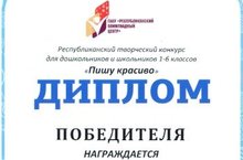 Прошел республиканский конкурс «Пишу красиво». Его провел олимпиадный центр при Министерстве образования РТ. Участвовали дошкольники и школьники. Наши воспитанники Ильясова Наргиз (набрала 59 баллов из 60), Бухмин Данииль, Артемьев Тимур, Хасбибуллина Инзиля получили дипломы победителей . Отдельная благодарность Сабировой Гельназ Мамлемзановне учителю-логопеду за подготовку воспитанников к олимпиаде.
