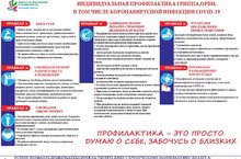 Индивидуальная профилактика гриппа, ОРВИ,в том числе коронавирусной инфекции COVID-19ПРАВИЛО 1. МОЕМ РУКИ Мойте руки с мылом после посещения любых общественных мест, транспорта, прикосновенийк дверным ручкам, деньгам, оргтехнике, перед едой и приготовлением пищи. При отсутствии доступа к воде и мылу необходимо использовать дезинфицирующие средстваили одноразовые влажные салфетки. Не прикасайтесь к лицу и глазам немытыми руками. Не пользуйтесь общими полотенцами.ПРАВИЛО 2. СОБЛЮДАЕМ ГИГИЕНУ РАБОЧЕГО МЕСТА И ПОМЕЩЕНИЙ Убедитесь, что Ваше рабочее место гигиенично. Для удаления вирусов с поверхности столов, стульев, дверных ручек, гаджетов, клавиатуры,мониторов, портфелей, сумок дезинфицируйте их, используя бытовые моющие средства (например,мыльный раствор). Часто проветривайте помещения на работе и дома, проводите влажную уборку.ПРАВИЛО 3. СОБЛЮДАЕМ ОБЩУЮ ГИГИЕНУ. Ежедневно принимайте душ, мойте волосы. Отдавайте предпочтение гладким прическам(распущенные волосы, часто контактируя с лицом, увеличивают риск инфицирования). В течение дня 3-4 раза промывайте проточной водой лицо и носовые проходы. Ограничьте приветственные рукопожатия, поцелуи и объятия. На работе принимайте пищу только в специально отведенных местах.ПРАВИЛО 4. ЗАЩИЩАЕМ ОРГАНЫ ДЫХАНИЯ С ПОМОЩЬЮ МЕДИЦИНСКОЙМАСКИ. Медицинские маски используются при посещении мест массового скопления людей, поездкахв общественном транспорте, при уходе за больными и при общении с лицами с острыми респираторнымивирусными инфекциями. Чтобы обезопасить себя от заражения, важно правильно носить маску:- маска должна тщательно закрепляться, плотно закрывать рот и нос, не оставляя зазоров;- влажную или отсыревшую маску следует сменить на новую;- маски следует менять каждые 2 часа;- при снятии старайтесь не касаться поверхностей маски руками;- использованная маска должна утилизироваться в мусорный контейнер;- не используйте вторично одноразовую маску. В случае отсутствия одноразовой маски, ее можно сшить несколько в домашних условиях из4 слоев марли. При уходе за больным, после окончания контакта, маску следует немедленно снять итщательно вымыть руки. Не рекомендуется использование маски на открытом воздухе. При чихании и кашле использованный тканевый носовой платок необходимо сразу менять,стирать ежедневно и проглаживать с обеих сторон. При возможности желательно использоватьбумажные носовые платки.ПРАВИЛО 5. ЧТО ДЕЛАЕМ ПРИ ПОЯВЛЕНИИ ПЕРВЫХ СИМПТОМОВ (высокаятемпература тела, озноб, головная боль, слабость, заложенность носа, кашель, затрудненное дыхание) Ограничьте контакты. Останьтесь дома и обратитесь в лечебное учреждение за медицинской помощью. Используйте для еды и питья индивидуальную посуду и мойте ее индивидуальной губкой смоющими средствами.ПРАВИЛО 6. ПРИ ВЫЕЗДАХ В КОМАНДИРОВКУ ИЛИ НА ОТДЫХВоздержитесь от поездок в зону риска по распространению вирусной инфекции, в том числекоронавирусной COVID-19.В случае выезда информируйте работодателя о стране, которую планируете посетить и сроках.В случае посещения страны зоны риска воздержитесь от контактов в течение 14 дней послевозвращения.ПРОФИЛАКТИКА – ЭТО ПРОСТО.ДУМАЮ О СЕБЕ, ЗАБОЧУСЬ О БЛИЗКИХ.